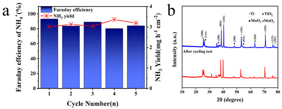 Based on the above test and analysis, Mo/TiO2-M was selected to operate a cycling test at −1.4 V vs. Ag/AgCl. As shown in Figure 6a, NH3 production exceeded 3 mg h−1 cm−2 and that Faraday efficiency stabilized over 80% in all groups. Cycling evaluation further highlighted Mo/TiO2-M’s outstanding and steady NO3−RR performance at −1.4 V vs. Ag/AgCl. Furthermore, a leaching test was conducted to determine possible Mo species in the electrolyte [60]. After the NO3−RR process, the concentration of Mo elements in the electrolyte was measured at only 0.0148 mg/L, suggesting almost no dissolution of Mo. Figure S6 displays the SEM image of the Mo/TiO2-M electrode after cycling tests. It is clear that no significant change can be observed, and nanoparticles are evident on the surface of the electrode. Figure 6b compares the XRD patterns of the Mo/TiO2-M electrode before and after cycling tests. Notably, almost no change can be seen, indicating the good structure stability of the Mo/TiO2-M electrode.