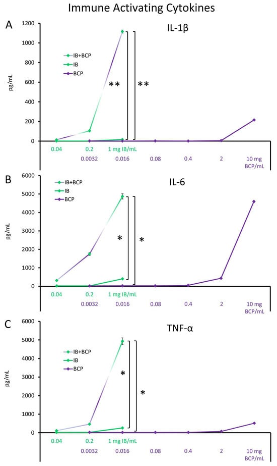 The culture supernatants from the PBMC cultures described above were tested for levels of immune-activating pro-inflammatory cytokines (Figure 1). BC-Pep at the highest dose of 10 mg/mL triggered immune-activating events leading to induction of interleukin-1-beta (IL-1β, Figure 1A), interleukin-6 (IL-6, Figure 1B), and tumor necrosis factor-alpha (TNF-α, Figure 1C). However, the immune-activating effects of BC-Pep alone declined at lower doses and were undetectable at the dose of 0.016 mg BC-Pep/mL cell culture. The IB without BC-Pep triggered increases of these cytokines at the dose of 1 mg IB/mL cell culture. The blend of IB + BC-Pep at that dose contained 0.016 BC-Pep/mL, i.e., the dose where effects of BC-Pep were undetectable. At that dose, the IB + BC-Pep blend triggered many-fold higher levels of all three cytokines than IB alone. For IL-1β, the amplified induction of IL-1β by IB + BC-Pep above that of BC-Pep or IB alone was highly significant (p < 0.01, Figure 1A). For both IL-6 and TNF-α, the induction by IB + BC-Pep over BC-Pep or IB alone was statistically significant (p < 0.05, Figure 1B,C).
