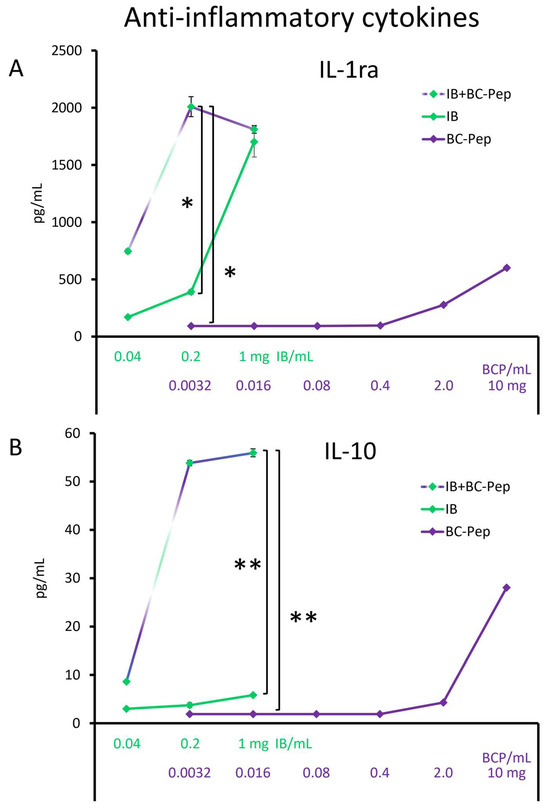 The culture supernatants from the PBMC cultures described above were tested for levels of anti-inflammatory cytokines (Figure 2). BC-Pep at the highest dose of 10 mg/mL triggered anti-inflammatory effects involving induction of interleukin-1 receptor antagonist (IL-1ra, Figure 2A) and interleukin-10 (IL-10, Figure 2B). However, the effects of BC-Pep alone declined at lower doses and were negligible at the dose of 0.016 mg BC-Pep/mL cell culture. For IL-10, the induction by IB + BC-Pep over BC-Pep or IB alone was highly significant at the dose of 1 mg IB/mL cell culture (p < 0.01, Figure 2B).