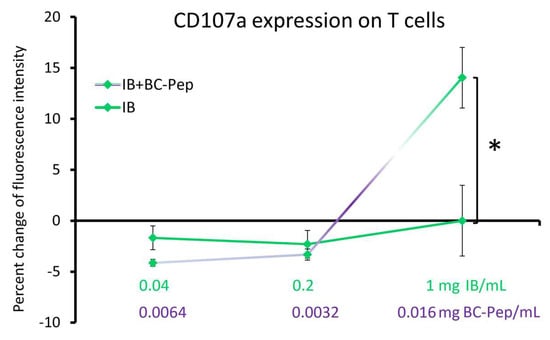 Peripheral blood mononuclear cells (PBMC) were co-cultured with the MHC class I deficient cell line K562 to allow cytotoxic cells to recognize and kill the K562 target cells through cell–cell contact, degranulation, and secretion of perforin and granzyme from NK and T cells, thereby killing the transformed target cells. During this process, the CD107a marker is transiently expressed on the cell surface of cytotoxic NK and T cells. In PBMC/K562 co-cultures treated with IB + BC-Pep, an increased CD107a expression was seen specifically on the T cell population, suggesting that IB + BC-Pep enhanced cytotoxic activity of cells within the T lymphocyte population (Figure 3). For the 1 mg IB/mL cell culture, the increased CD107a expression on T cells was statistically significant for IB + BC-Pep when comparing to cells treated with IB alone (p < 0.05).