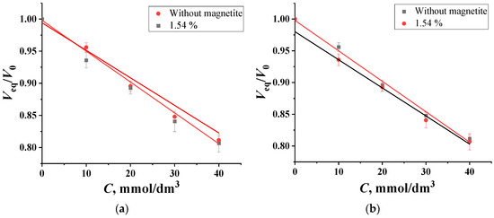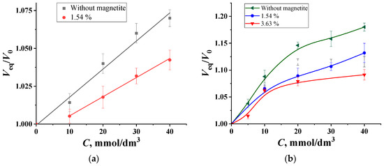 2.1.3. The Effect of the Amount of Embedded Magnetite on the Concentration Dependences of V/V0 in a Basic Medium