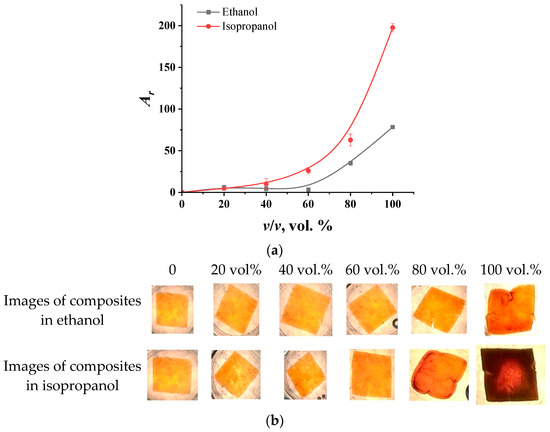 As for electrolyte solutions, concentration dependencies of the intensity of colorimetric parameters (Ar) for a film aged for 2 min in iron salts were obtained for aqueous alcohol solutions. The choice of the film was due to the highest contrast of the images of the swollen and compressed films, since, when alcohol is exposed to the PVA gel, the film is mainly compressed. The obtained graphs of the dependence of the signal on the volume fractions of alcohols are shown in Figure 5. As can be seen from the photos below, with an increase in the proportion of alcohol in the solution, the film becomes darker.