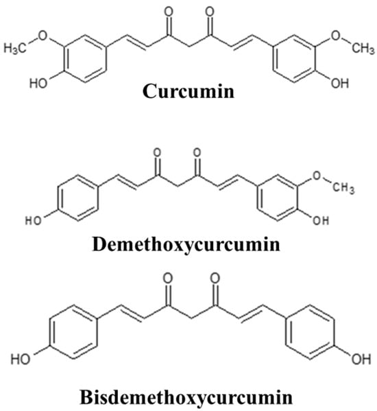 Chemical structure of curcumin, demethoxycurcumin, and bisdemethoxycurcumin.