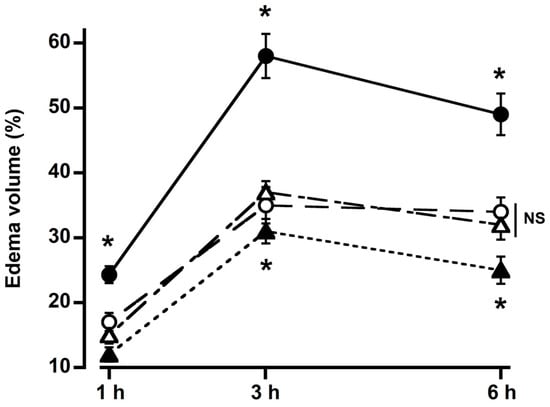 Effects of 100 mg/kg body weight of curcumin (○), demethoxycurcumin (△), and bisdemethoxycurcumin (▲) on rat paw edema caused by carrageenan (●). All three active compounds of turmeric significantly inhibit carrageenan-induced paw edema. Bisdemethoxycurcumin was more potent than the other two compounds. For each point, the mean ± SD of four rats is used. * p < 0.05 vs. carrageenan. NS = not significant.