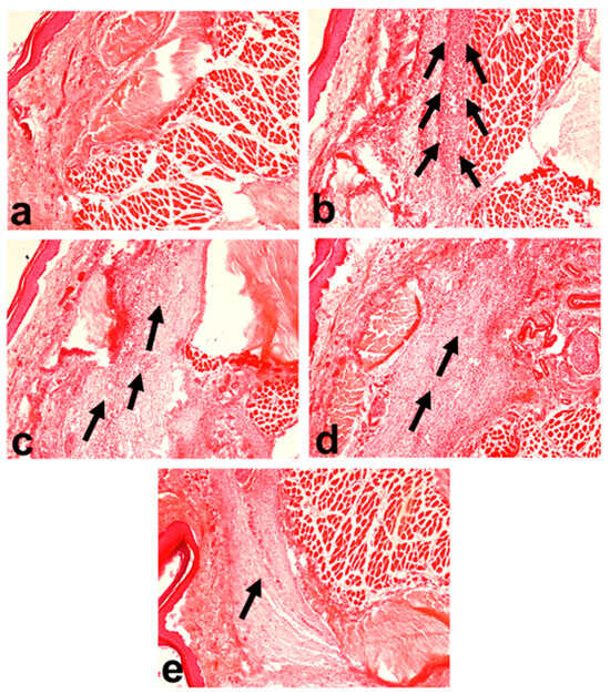 Histoarchitecture of rat paw tissue at 3 h of carrageenan injection (hematoxylin and eosin stain) (original magnification = 100× and scale bar = 50 μm): (a) control, showing normal architecture of dermis and hypodermis; (b) carrageenan, characterized by acute inflammation in the dermis and hypodermis extending to the underlying muscular tissue with a large influx of inflammatory cells; (c) carrageenan + curcumin; (d) carrageenan + demethoxycurcumin; and (e) carrageenan + bisdemethoxycurcumin showed a moderate density of inflammatory cells. The number of arrows shows the relative density of penetrated inflammatory cells.
