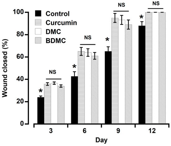 Effects of topical application of curcumin, DMC, and BDMC (1%) on the wound-healing time in mice. All the active compounds significantly accelerated the healing time. The three compounds did not differ substantially from one another. For each point, the mean ± SD of three mice is used. * p < 0.05 vs. curcuminoids. NS = not significant.