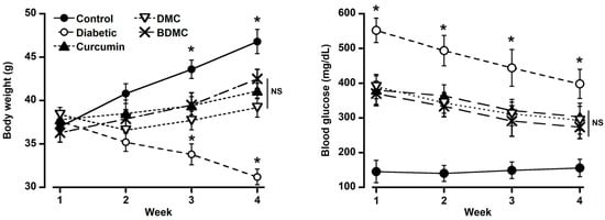 Effects of curcumin, demethoxycurcumin, and bisdemethoxycurcumin on diabetes-induced changes in body weight and blood glucose level in mice. Streptozotocin-induced diabetes significantly decreased body weight and increased blood glucose levels, which were significantly improved by all the compounds in turmeric. There was no significant difference among the three compounds. For each point, the mean ± SD of five mice is used. * p < 0.05 vs. control. NS = not significant.