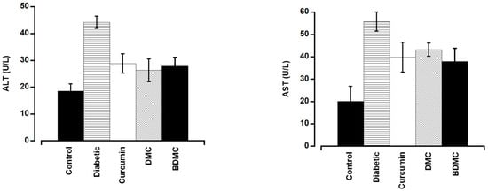 Serum ALT and AST levels were significantly greater in the group that received the intraperitoneal injection of streptozotocin (44.2 U/L and 55.8 U/L, respectively) than in the control group (18.6 U/L and 20.1 U/L, respectively), suggesting that the injection caused liver damage in the diabetic group (Figure 6). AST and ALT levels were significantly lower in the curcumin-, DMC-, and BDMC-treated groups than those of the diabetic group but higher than those of the control group (Figure 6).