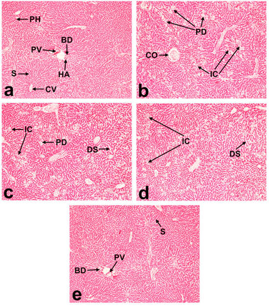 After blood collection, the liver was removed and preserved in 10% formalin. Then, the liver tissue was dehydrated in a progressively higher concentration of alcohol, cleared in xylene, and embedded in paraffin wax. Hematoxylin and eosin were used to stain the 5 µm thick sections of paraffin blocks for microscopic examination.