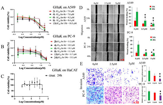 GHaK suppressed the cell viability, migration, and invasion of PC-9 and A549 cells. (A,B). GHaK suppressed the cell viability of A549 and PC-9 cells at 2, 4, 6, 8, and 15 h with an additional inhibition on PC-9 cells at 24 h with the lowest IC50 value of 7.8 μM at 4 h for A549 and of 10.1 μM at 6 h for PC-9 cells. (C) GHaK did not reduce the cell viability of HaCaT cells after 24 h of treatment. (D) GHaK inhibited the migration of PC-9 and A549 cells at the dose of 5 μM at 48 h (for PC-9 cells, t = 3.86, p < 0.05; for A549 cells, F = 14.77, p < 0.01) and at 24 h (for PC-9 and A549 cells, F = 5.17, 5.74, respectively, p < 0.05) with an additional inhibition at the dose of 2.5 μM at 48 h (for PC-9 cells, t = 3.59, p < 0.05; for A549 cells, F = 14.77, p < 0.01). The pictures were magnified by 4 times. (E) GHaK inhibited the invasion of PC-9 (t = 12.75, p < 0.01) and A549 cells (t = 10.11, p < 0.01) at the dose of 5 μM after 24 h of treatment. (* p < 0.05; ** p < 0.01). The pictures were magnified by 10 times.