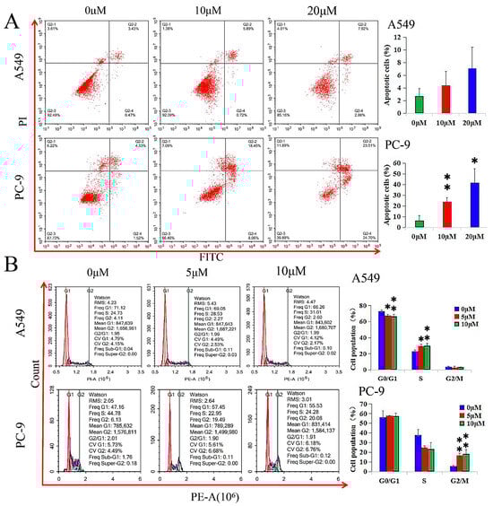 GHaK led to a lower G0/G1 population percentage (F = 9.00, p < 0.05) in A549 cells and arrested the cell cycle in the S phase (F = 8.74, p < 0.05) and in the G2/M phase (F = 20.86, p < 0.01) at the doses of 5 and 10 μM after 15 and 20 h of treatment in A549 and PC-9 cells, respectively (Figure 2B).