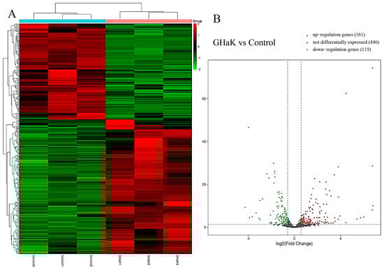 Heatmap and volcano plot showing differential expressions of miRNAs after GHaK treatment. (A) Heatmap showing differential expressions of miRNAs caused by GHaK treatment for 20 h on PC-9 cells. (B) Volcano plots exhibiting a total of 446 miRNAs that were identically expressed, 161 miRNAs that were up-regulated, and 115 miRNAs that were down-regulated after GHaK treatment for 20 h on PC-9 (log2 (fold change) > 1.5, p < 0.05).