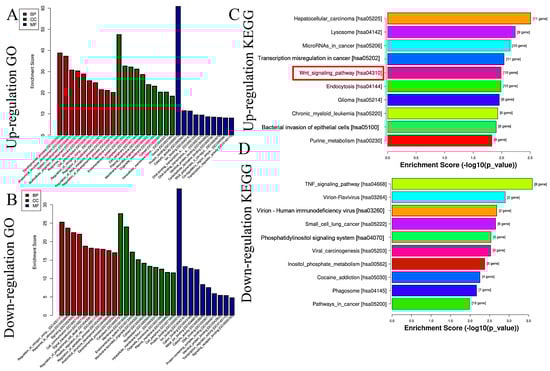 Based on miRNA sequencing data (miRNA-seq), a total of 722 miRNAs were selected for paired comparisons, as shown in Figure 3A. Among these, 161 miRNAs were up-regulated and 115 miRNAs were down-regulated (Figure 3B). The most enriched categories in terms of up- or down-regulated biological processes (BPs) were the development process, anatomical structure development, and system development and the nitrogen compound metabolic process, response to stimulus, and response to signaling, respectively. In terms of up- or down-regulated cellular components (CCs), the most enriched categories were the membranes, endomembrane system, and cytoplasm and the cytoplasm, membrane, and endomembrane system, respectively. In terms of the up- or down-regulated molecular functions (MFs), the most enriched categories were protein binding, catalytic activity, ion binding, and protein binding and ion binding and cation binding, respectively (Figure 4A,B). KEGG enrichment analysis showed that differentially up-regulated miRNAs were widely distributed in the top five pathways of hepatocellular carcinoma, lysosome, microRNAs in cancer, transcription misregulation in cancer, and Wnt signaling pathway, and the differentially down-regulated miRNAs were extensively distributed in the top five pathways of the TNF signaling pathway, vivion flavivirus, virion–human immunodeficiency, small cell lung cancer, and phosphatidylinositol signaling system (Figure 4C,D).