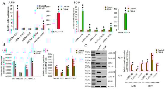RT-PCR and Western blotting validated differentially expressed miRNAs involved in the Wnt signaling pathway caused by GHaK treatment and expressions of their target genes. (A). RT-PCR analysis confirmed up-regulations of miR-4516, miR-4284, and miR-204-5p in PC-9 (t = −18.74, −16.26, and −18.07, respectively, p < 0.01) and A549 cells (t = −12.00, −17.64, and −9.70, respectively, p < 0.01) with additional up-regulations of miR-12136, miR-4463, and miR-1296-3p in PC-9 cells (t = −8.70, p < 0.01; t = −4.32, −4.24, p < 0.05) caused by GHaK treatment. (B). RT-PCR analysis confirmed down-regulations of the target genes Wnt 8B, DVL3, and FOSL1 in both PC-9 (t = 6.83, 7.98, and 5.30, respectively, p < 0.01) and A549 cells (t = 5.68, 6.49, p < 0.01; t = 4.49, p < 0.05) with an additional down-regulation of FZD2 in PC-9 cells (t = 5.00, p < 0.01) involved in the Wnt signaling pathway caused by GHaK treatment. (C). Western blotting analysis confirmed down-regulation expressions of p-GSK-3β, cyclinA1, and CDK2 in A549 cells (t = 19.46, 46.00, and 44.50, respectively, p < 0.01) and p-GSK-3β, cyclinB1, and CDK1 in PC-9 cells (t = 25.36, p < 0.01; t = 4.52, p < 0.05; t = 72.00, p < 0.01) involved in the Wnt signaling pathway caused by GHaK treatment. (* p < 0.05; ** p < 0.01).