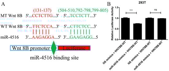 Furthermore, the lack of difference in the luciferase ratio between the miR-4516 mimics + mutant-type (MT) Wnt8B construct and the control suggested that the binding site mutation in the Wnt 8B gene disrupted the combination between miR-4516 and its target site, abolishing the inhibitory effect observed with the WT Wnt 8B construct (Figure 6).