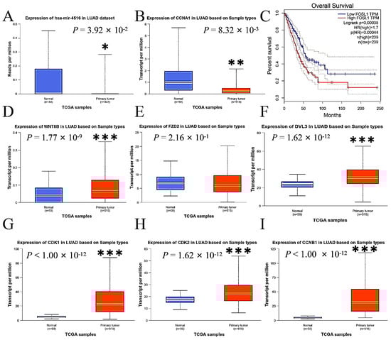 This study compared the expression levels of miR-4516, Wnt 8B, FZD2, DVL3, FOSL1, CDK1, CDK2, CCNA1, and CCNB1 in primary LUAD tumor tissue with those in normal lung tissue using data from The Cancer Genome Atlas (TCGA) database to assess the consistency of our findings with the human sample. The expressions of miR-4516 were lower (Figure 7A), while the expressions of Wnt 8B, DVL3, FOSL1, CDK1, CDK2, CCNA1, and CCNB1 were enhanced in tumor tissue compared to normal lung tissue in the human samples (Figure 7B,D–I). Additionally, overall survival was inversely associated with expressions of FOSL1 in patients with LUAD according to data from the TCGA and the Genotype-Tissue Expression (GTEx) databases by Gene Expression Profiling Interactive Analysis (http://gepia.cancer-pku.cn/, accessed on 5 March 2024) (Figure 7C).