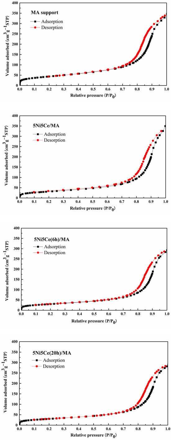 To generate two treated catalysts with various interactions on the surface, the 5Ni5Ce(xh)/MA (xh = 6 h and 20 h) catalysts were synthesized using an ammonia vapor diffusion impregnation method outlined in our previous work [19]. The wet solid cake of the impregnated 5Ni5Ce/MA catalyst was kept under ammonia vapor diffusion conditions at ambient temperature in a closed chamber for 6 h (5Ni5Ce(6 h)/MA) and for 20 h (5Ni5Ce(20 h)/MA). During the ammonia diffusion, a limited amount of hydroxide ions was intercalated with the nitrate ions of the Ni2+ and Ce3+ solutions, resulting in the slow growth of the layered double hydroxide nanosheet structure. Hence, the size and dispersion of the layered double hydroxide nanosheets were controlled by diffusion time. The resulting wet powder was dried and calcined using similar conditions to those used for the 5Ni5Ce/MA catalyst. All catalysts were pelletized, ground, and sieved to a particle size range between 355 and 710 μm.