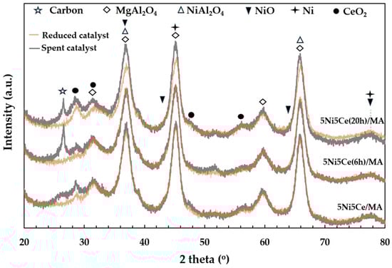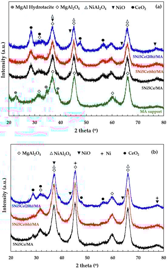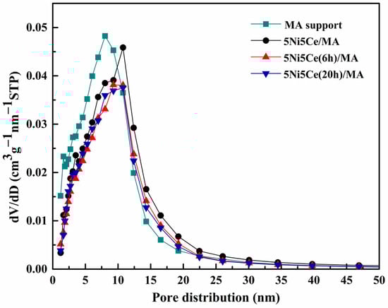 The textural properties of all samples were examined using N2 adsorption–desorption measurements. The isotherm patterns of all samples (Figure 2) exhibit a type IV(a) isotherm feature of mesoporous materials with the combination of H2(b) and H3 hysteresis loops (IUPAC), correlating to the connection of the bottleneck-shaped and plate-shaped pores in the relative pressure range (P/P0) of 0.60–1.00 [25,26,27,28]. Using the BJH method, the pore size distribution curves of all samples are established in Figure 3. Table 1 reports the average pore size diameter estimated from the BJH method and the surface area with the total pore volume calculated from the BET equation. The support and catalyst samples show an average pore size diameter smaller than 25.0 nm. The surface of the MA support has an area of 151 m2 g−1 with an average pore size diameter of 8.0 nm and a total pore volume of 0.52 cm3 g−1. When 5 wt% Ni and 5 wt% CeO2 were loaded onto the MA support (5Ni5Ce/MA), the surface area decreased to 108 m2 g−1 with a total pore volume of 0.51 cm3 g−1, whereas the average pore size diameter increased to 10.8 nm. These results can be explained by the blockage of smaller pores of the MA support by large nanoparticles [29,30]. Considering the ammonia vapor diffusion impregnation of 5 wt% Ni and 5 wt% CeO2 for 6 h (5Ni5Ce(6 h)/MA) and 20 h (5Ni5Ce(20 h)/MA), the surface area and total pore volumes of these two catalysts are similar (101 m2 g−1 and 0.43–0.44 cm3 g−1, respectively). These values of the textural properties are lower than 5Ni5Ce/MA due to the stronger blocking effect caused by the growth of the mixed-oxide nanoparticles.