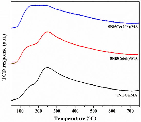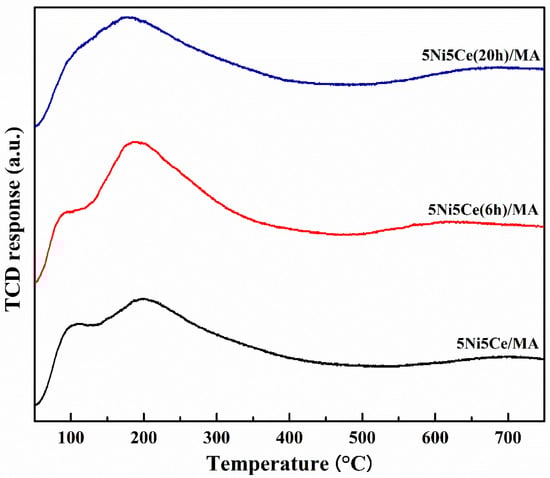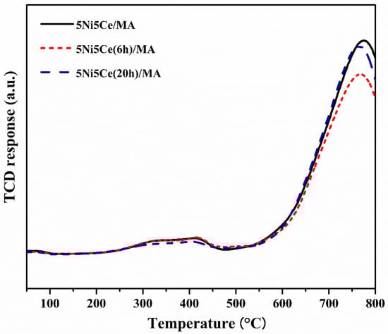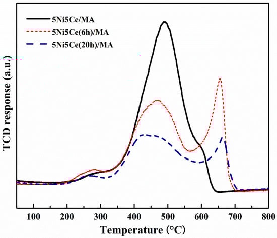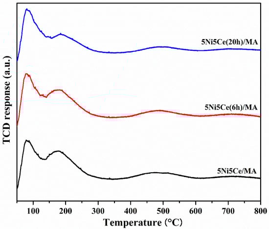 The oxygen mobility in all reduced catalysts was further evaluated by O2-TPD measurement (Figure 9) at a temperature range from 50 °C up to 800 °C. The oxygen transfer on the catalyst can be predicted via the O2-TPD profile. The oxygen desorption peaks at low temperature are assigned to surface oxygen, including physiosorbed oxygen molecules and oxygen from oxygen vacancies (resulting from the redox property of Ce4+/Ce3+). At the higher temperature range, the desorption peaks are attributed to lattice oxygen [16,60,61,62,63,64,65]. The oxygen desorption quantities according to the various types of oxygen mobility were calculated (Table 5). The O2-TPD results may be relative to the XPS analysis. The 5Ni5Ce/MA catalyst shows two desorption peaks at different ranges of temperature. Compared to 5Ni5Ce/MA, the catalyst treated in the ammonia vapor for 6 h (5Ni5Ce(6 h)/MA catalyst) presents less surface oxygen and more lattice oxygen due to the good dispersion of small NiO-CeO2 nanoparticles initiated on the surface. For the comparison of treated catalysts (6 h and 20 h), surface oxygen increases, lattice oxygen decreases, and the peaks of surface and lattice oxygen merge smoothly in the O2-TPD profile of 5Ni5Ce(20 h)/MA. These results indicate the connection of the surface and lattice oxygen through the electronic interaction of Ni-NiO-CeO2 produced by 20 h ammonia vapor treatment.