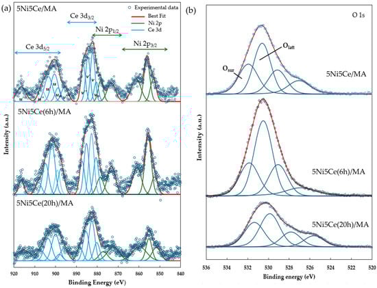 The reduction profiles of the oxide species (Figure 5) were carried out by the H2 temperature program reduction (H2-TPR) to determine the reducibility and the interaction among the components of the calcined catalysts. The H2-TPR profiles of all the calcined catalysts demonstrate two temperature reduction ranges. The reductions at lower temperature ranging from 250 °C to 450 °C correspond to the NiO species poorly interacting with other components and the partial reduction in CeO2. The reduction peaks at temperatures higher than 500 °C are assigned to the moderate-to-strong interaction of NiO-CeO2 and NiO-CeO2-MA and the formation of spinel oxides such as NiAl2O4 due to the strong metal–support interaction (SMSI) effect [42,43,44,45,46,47]. The XPS spectra of Ni 2p + Ce 3d (Figure 6a) and O 1s (Figure 6b) were obtained to investigate the chemical states of Ni and Ce on the surface of all ex situ reduced catalysts. In Figure 6a, the Ni 2p core level spectra show the presence of metallic Ni (Ni0) at a binding energy (BE) of 851.7–852.9 eV, and Ni2+ at a BE of 855.2–855.9 eV. The Ce 3d core level spectra show the co-existence of Ce4+ (blue peaks = v, v″, v‴, u, u″, and u‴) and Ce3+ (blue peaks = v0, v′, u0, and u′) [48,49,50,51]. The O 1s peak (Figure 6b) was deconvoluted to identify the oxygen species of the reduced catalysts. The peaks of lattice oxygen (Olatt) in NiO, CeO2, NiAl2O4, and the MA support was found at a BE of about 530 eV. The peaks of surface oxygen (Osur) based on oxygen vacancies and hydroxyl were observed at higher BE values (531–532 eV) [52,53]. The relative concentration of metallic nickel Ni ([Ni0]/[Ni0] + [Ni2+]), the relative concentration of Ce3+ ([Ce3+]/[Ce4+] + [Ce3+]), and the Osur/Olatt ratio were then evaluated from their peak areas (Table 2).
