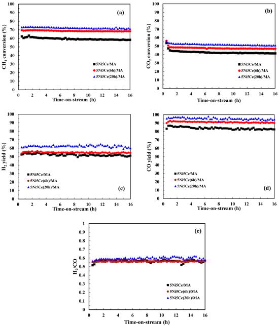 The CMR catalytic behaviors of the 5Ni5Ce/MA and treated 5Ni5Ce(xh)/MA catalysts were investigated at 600 °C under atmospheric pressure for 16 h. The performance was evaluated by means of CH4 conversion, CO2 conversion, and the H2/CO ratio of the syngas product (Figure 10). The 5Ni5Ce/MA catalyst presents an average CH4 conversion of 59.4%, an average CO2 conversion of 43.5%, and a H2/CO ratio of 0.58 (H2 yield = 51.8% and CO yield = 82.7%). Compared to 5Ni5Ce/MA, the 5Ni5Ce(6h)/MA catalyst reflects the relative higher activity toward CH4 conversion (68.8%) and CO2 conversion (47.9%) with similar H2/CO ratio of 0.56 (H2 yield = 54.8% and CO yield = 90.9%). The highest CH4 conversion of 72.2%, the highest CO2 conversion of 52.1%, and a H2/CO ratio of 0.59 (H2 yield = 62.3% and CO yield = 95.3%) were obtained from the 5Ni5Ce(20h)/MA catalyst. The enhancement of reactant activities as well as product yields on 5Ni5Ce(20h)/MA can be attributed to the number of active sites in the Ni-NiO-CeO2 network. As observed in CO2-TPD, these Ni-NiO-CeO2 nanostructures develop their electronic interactions with the nanostructure over the course of treatment. The surface hydroxide on the structure increases the turnover frequency of CO2 on the Ni-NiO-CeO2 network, agreeing with the CO2-TPD measurement. These surface hydroxyl sites allow Ni metal sites to be active toward CH4. For the CO yield values in which CH4 and CO2 consumptions were considered, the treated catalysts had smaller amounts of carbon deposition than the untreated catalyst. The coke deposition analysis is discussed in the following part. Moreover, the highest H2 yield (62.3%), the highest CO yield (95.3%) and the slightly higher H2/CO ratio (0.59) observed on the 5Ni5Ce(20 h)/MA catalyst imply a reduced RWGS side reaction effect. This is assigned to the rehydration property promoting H2O adsorption–dissociation [20].