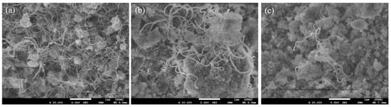 FESEM micrographs of spent (a) 5Ni5Ce/MA, (b) 5Ni5Ce(6 h)/MA, and (c) 5Ni5Ce(20 h)/MA catalysts.