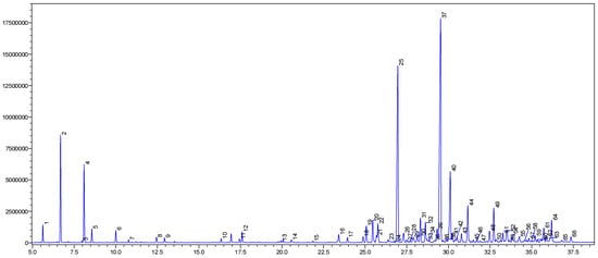 Each fresh powder sample weighing 1.0 kg underwent hydro-distillation using a Clevenger apparatus. The extraction process was conducted for 4.0 h, facilitating the release of EOs from the plant material. Following hydro-distillation, the oil was obtained by decantation and subsequently dried over Na2SO4 to eliminate any residual water content. The resulting dried EO was then stored in sealed vials under a temperature of −5 °C to safeguard their stability and maintain the integrity of its chemical composition for subsequent analysis [37].