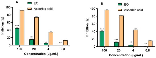 Free radical scavenging activity ((A) DPPH assay and (B) ABTS assay) from P. leptostachya leaf EO. ** p < 0.01, *** p < 0.001 compared with positive control.
