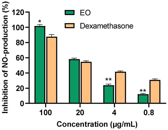 Inhibition of NO production (%) in LPS-stimulated RAW 264.7 cells of the P. leptostachya leaf EO. * p < 0.05, ** p < 0.01 compared with positive control.