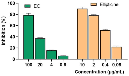 The antioxidant activity of the P. leptostachya leaf EO was assessed using DPPH and ABTS assays. Overall, the results indicated that the EO did not exhibit any antioxidant properties, as its IC50 value exceeded 100 µg/mL compared with the positive control, ascorbic acid (IC50 7.37 ± 0.27 µg/mL) for DPPH and (IC50 4.58 ± 0.23 µg/mL) for ABTS assays (Figure 2 and Table 2).