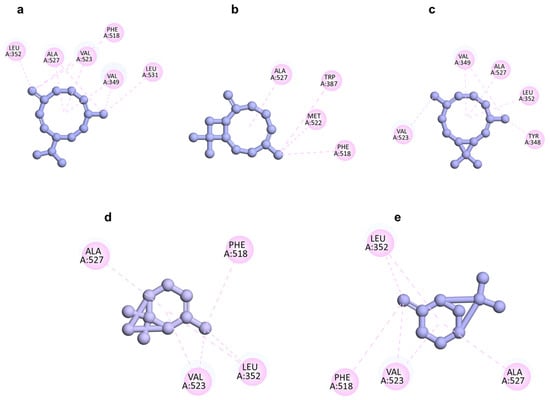 A high binding energy indicates stronger interaction between the tested compounds and the protein. The five compounds, characterized by a lipophilic carbon framework, demonstrated moderate docking scores ranging from −8.6 to −6.0 kcal/mol compared with diclofenac as a co-ligand (−8.4 kcal/mol). Given their specific chemical structure, the interactions between these five docked compounds and the protein binding site primarily involved hydrophobic interactions. Residues Leu352, Val523, and Ala527 within the COX-2 binding pocket were identified as crucial contributors to this nonpolar interface formation. Among a–e, compound a exhibited the lowest docking score (−8.6 kcal/mol) against COX-2, which was comparable to the positive control diclofenac (−8.4 kcal/mol). It suggested that a had the strongest interaction with the COX-2 enzyme. Following this, c showed a docking score of −7.7 kcal/mol, followed by b (−6.6 kcal/mol), while d (−6.0 kcal/mol) was similar to e (−6.1 kcal/mol). In summary, the lowest docking scores observed for a–e correlated with the significant anti-inflammatory activity of the EO (Figure 5 and Figure 6 and Table 3). This suggested that these compounds may play a key role in mediating the anti-inflammatory effects of P. leptostachya leaf EO by interacting strongly with the COX-2 enzyme, thus prompting further investigation into their therapeutic potential.
