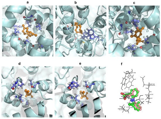 Three-dimensional docking poses showing interactions of germacrene D (a), (E)-caryophyllene (b), bicyclogermacrene (c), α-pinene (d), and β-pinene (e) in the binding sites of COX-2 (PDB ID: 1PXX); (f) Overlapped structures of native ligand crystal structure of diclofenac (green) and re-docked ligand (wheat).