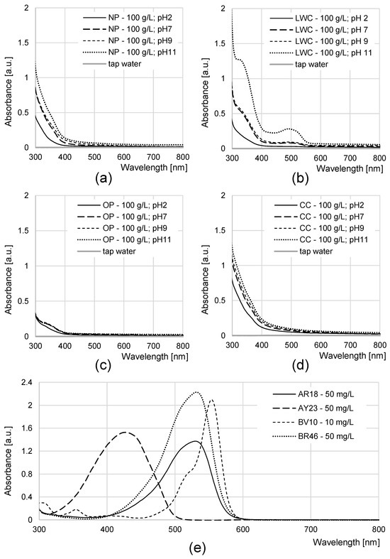 - In the case of the analyses conducted in Section 4.3, Section 4.4 and Section 4.5, additional experimental series without dye were performed for each tested sorbent. Aqueous solutions obtained in this way were used to calibrate the spectrophotometer before dye concentration analysis. This procedure enabled the elimination of measurement errors triggered by putative colored contaminants released to the solutions from the waste paper materials.