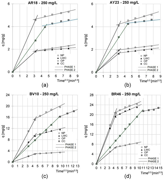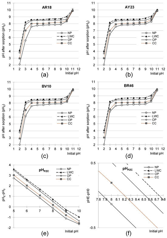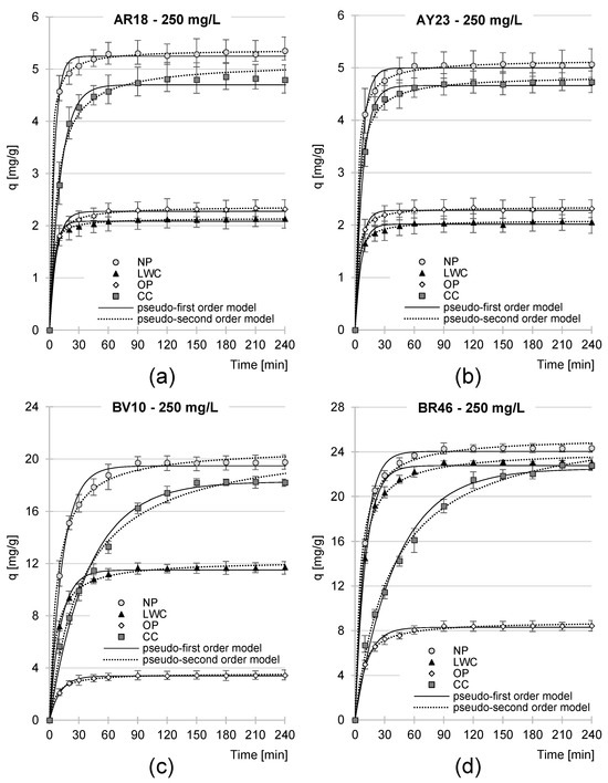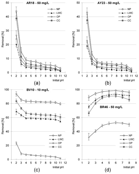 - Each sorbent (NP, LWC, OP, and CC) was tested with respect to 4 dyes (AR18, AY23, BV10, and BR46).