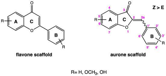 - Zwergel, C.; Gaascht, F.; Valente, S.; Diederich, M.; Bagrel, D.; Kirsch, G. Aurones: Interesting natural and synthetic compounds with emerging biological potential. Nat. Prod. Commun. 2012, 7, 389–394. [Google Scholar] [CrossRef]