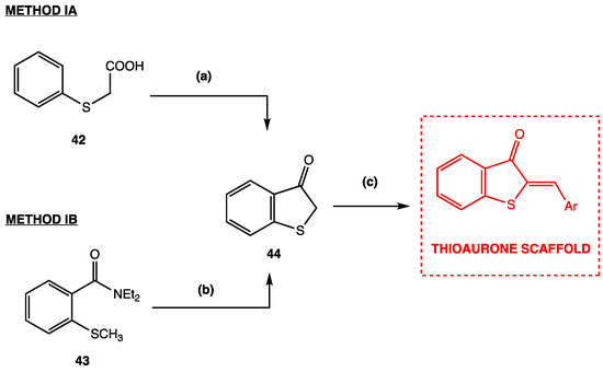 - Nakamura, A.; Rao, F.; Ukiya, K.; Matsunaga, R.; Ohira, S.I.; Maegawa, T. A concise synthesis of thioaurones via NBS-induced cyclization of MOM-protected 2′-mercaptochalcones. Org. Biomol. Chem. 2023, 21, 1134–1137. [Google Scholar] [CrossRef] [PubMed]