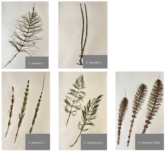 - Christenhusz, M.J.M.; Bangiolo, L.; Chase, M.W.; Fay, M.F.; Husby, C.; Witkus, M.; Viruel, J. Phylogenetics, classification and typification of extant horsetails (Equisetum, Equisetaceae). Bot. J. Linn. Soc. 2019, 189, 311–352. [Google Scholar] [CrossRef]