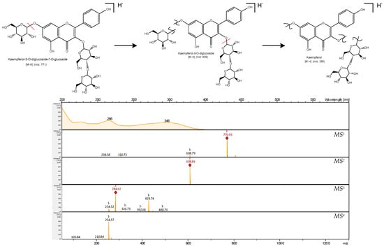 - Llorach, R.; Gil-Izquierdo, A.; Ferreres, F.; Tomás-Barberán, F.A. HPLC-DAD-MS/MS ESI characterization of unusual highly glycosylated acylated flavonoids from cauliflower (Brassica oleracea L. var. botrytis) agroindustrial byproducts. J. Agric. Food Chem. 2003, 51, 3895–3899. [Google Scholar] [CrossRef] [PubMed]