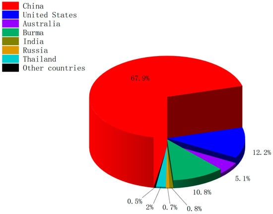 Due to the rapid growth in the demand for rare earths, the global production of rare-earth oxides (REOs) continues to rise. There are global variations in the production, consumption, and processing of rare-earth element resources. As shown in Figure 1, in 2023, out of the total global REO production of 350,000 tons, China dominated with 240,000 tons, followed by the United States and Burma []. China also holds a leading position in global REO processing and is the largest consumer of rare-earth elements []. The large-scale extraction of rare-earth elements (REEs) can significantly damage environmental ecosystems, posing a threat to the health of local residents through contaminated soil and water sources []. In addition, research indicates that rare earth mining can also increase antibiotic resistance in the surrounding soil []. Currently, despite the growing demand for rare-earth materials, only about 1% of the rare-earth elements in waste containing REEs are recycled []. Therefore, finding efficient methods for recycling rare earths has attracted the attention of many researchers who aim to reduce the need for extensive REE mining.