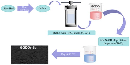 Expanding the scope of graphene-based materials, Mahmoud et al. produced graphene quantum dots (GQDOs) from rice husks and created a nanobiocomposite adsorbent with enhanced surface hydroxyl groups. The GQDO production method is shown in Figure 3. This innovative approach demonstrates the potential of utilizing waste materials to synthesize graphene-based adsorbents []. Nitrogen-doped nanoscale porous graphene (NDNG) also enters the scene as a promising membrane separation material, selectively engaging in electrostatic interactions with pyrrole-N to effectively separate Sc(III) from other rare-earth ions [].