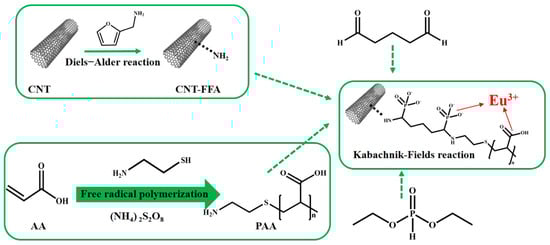 Taking a different approach, Guo et al. utilized a Diels–Alder reaction to introduce amino groups to carbon nanotubes through the reaction with furfurylamine. Figure 4 illustrates the production method of the amino-functionalized carbon nanotube composite material CNT-FFA-PAA. A subsequent combination with a polymer, facilitated via the Kabachnik–Fields reaction, resulted in a significant enhancement in its adsorption capacity for Eu(III) ions. This study highlights the versatility of modified CNTs in achieving substantial improvements in adsorption efficiency [].