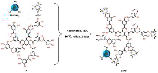 Zheng et al. introduced a method called double template-docked ion-imprinted (DTD-OII) per layer []. They successfully created double template-docked oriented ion-imprinted mesoporous bilayer films (IIBFs) for the purpose of selectively adsorbing Nd(III) and Dy(III). In comparison to other adsorbents for rare-earth elements, the IIBFs demonstrated rapid equilibration and high adsorption capacity in acidic solutions. Han et al. synthesized copolymers through a reversible addition-breakage chain transfer reaction, utilizing styrene (S) and glycidyl methacrylate-iminodiacetic acid (GMA-IDA) as monomers []. The experimental results indicate that HCP-2 exhibits a maximum adsorption capacity of 145.65 mg/g for terbium at pH 5.8 and a temperature of 323 K, demonstrating notable competitiveness compared to other reported porous adsorbents. Liu et al. fabricated a magnetic porous organic polymer, MTAP (Figure 7), utilizing natural polyphenolic tannins as monomers and hexachlorocy-clotriphosphononitrile as a cross-linking agent. The experimental findings indicate that the adsorption of rare-earth elements, specifically Ce, Nd, Eu, and Gd, occurs rapidly, with adsorption equilibrium being achieved within 2 min [].