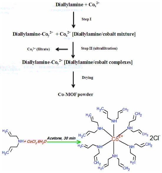 The provided text describes a simplified flow diagram illustrating the synthesis procedures of Co−MOF using the sol–gel method [].