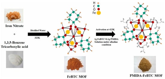 Khalil et al. used cobalt chloride, diallylamine, and methanol to form a metal–organic structure through self-assembly to obtain Co-MOF (the synthesis schematic is shown in Figure 10); the adsorption capacity of Co-MOF for Ce(III) was found to be 74.65 mg/g at pH 5.1 []. Song et al. self-assembled with N-heterocyclic imide ligand, homophthalic acid diimide, and cadmium nitrate tetrahydrate to form amino-functionalized microporous two-dimensional MOFs (Cd-PDI-2D) and three-dimensional MOFs (Cd-PDI-3D) at 115 °C and 85 °C, and Cd-PDI-2D showed excellent adsorption of all Ln(III) at pH = 6.8. In contrast, almost no adsorption of Cd-PDI-3D Ln(III) was observed []. Sinha et al. utilized N-(phosphonomethyl)iminodiacetic acid (PMIDA) coordinated at the Fe site of FeBTC to produce PMIDA@FeBTC MOF-functionalized metal–organic skeleton material through complexation (the synthesis schematic is shown in Figure 11), which adsorbed as high as 232.5 mg/g at 298K []. Allahyari Sareh Ammari et al. used a mixture of Zn(OAc)2·3H2O, 1,4-benzene dicarboxylic acid (H2bdc), benzimidazole (bim), NaOH, etc., stirred in an autoclave for 72 h to obtain [Zn(bim)2(BDC)]n metal–organic frameworks (ZBB), which at pH = 7, showed a La(III) adsorption amounting to 156.7 mg/g []. Paz Roxana et al. used Zn(NO3)2·6H2O and terephthalic acid (H2BDC) dissolved in N,N-dimethylformamide (DMF), among other materials, and by heating, cooling, separating, and drying, obtained (Zn-BDC) MOF, which adsorbed up to 598.0 mg/g of Eu(III) at pH = 7 []. Many of the above studies were only carried out under weakly acidic conditions (pH of about 7), and when the pH is too low and the solution conditions are harsh, their structures will be difficult to preserve, greatly limiting their applications. In the future, their strength in aqueous solution can be improved by increasing the strength of the surface coordination bonds.
