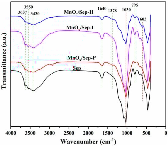The FTIR spectra of Sep, MnOx/Sep-P, MnOx/Sep-I, and MnOx/Sep-H.