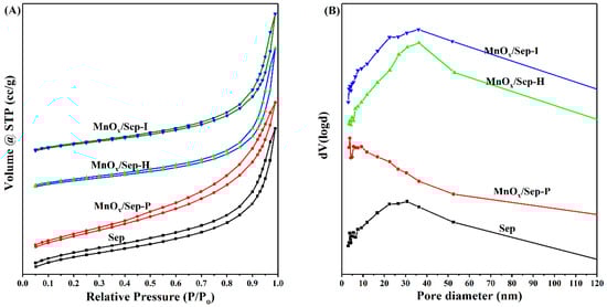 Based on the previous literature [50,51], the N2 adsorption–desorption curve and pore size distribution patterns of Sep, MnOx/Sep-P, MnOx/Sep-I, and MnOx/Sep-H are displayed in Figure 3. Each sample showed a type IV isotherm and a type H4 hysteresis loop, indicating that they were all made of mesoporous material [36,43]. Also, the physical parameters of the mesoporous materials and surface element composition of the samples are displayed in Table 1. The pore diameter was between 10 and 50 nm. The SBET, Vpore, and Dpore of Sep were 325.16 m2/g, 0.32 cm3/g, and 3.82 nm. The partial coverage of the Sep surface pores by Mn species causes the SBET to fall to 229.45, 136.13, and 176.77 m2/g after adding manganese species. However, the Vpore for the samples were barely altered. In contrast to Sep (3.82 nm), the Dpore of MnOx/Sep-P and MnOx/Sep-I decreased from 3.82 nm to 3.41 nm and 3.42 nm, respectively. But the Dpore of MnOx/Sep-H (3.82 nm) remained relatively unchanged, indicating that the manganese species did not block the pores of sepiolite in MnOx/Sep-H catalysts. HCHO adsorption might be favored by a bigger pore size; hence, it further promotes the catalytic activity of the catalyst.