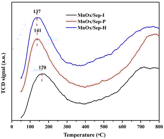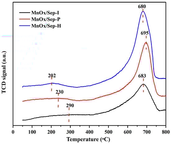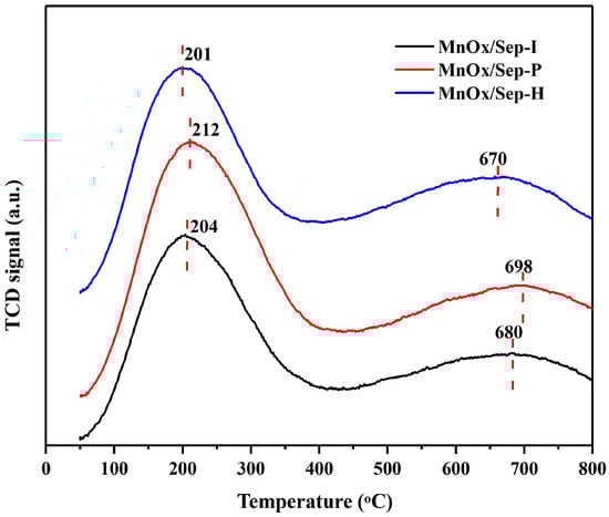 Figure 4 display the H2-TPR profiles of the catalysts as prepared. The purpose of the experiment was to assess the reactivity and reducibility of various oxygen species in catalysts. Each sample curve had two distinct reduction peaks, as Figure 4 illustrates. These peaks corresponded to the reduction of bigger-particle manganese oxides (MnO2→Mn2O3→Mn3O4→MnO) and surface-active oxygen [30,52]. Theoretically, significant reducibility and high reactivity of the oxygen species are indicated by a lower reduction temperature. Since the peak of MnOx/Sep-H’s reduction temperature (202 °C) is lower than that of MnOx/Sep-P (230 °C) and MnOx/Sep-I (290 °C), it may be concluded that MnOx/Sep-H’s surface-adsorbed oxygen showed the best reducibility [48]. Furthermore, for MnOx/Sep-H, MnOx/Sep-P, and MnOx/Sep-I, the reduction temperatures were 680 °C, 695 °C, and 683 °C for bigger-particle manganese oxides, and the specific gravity of hydrogen consumption was determined to be 1.8:1.6:1, suggesting that MnOx/Sep-H has more lattice oxygen species, which may also promote catalytic activity.