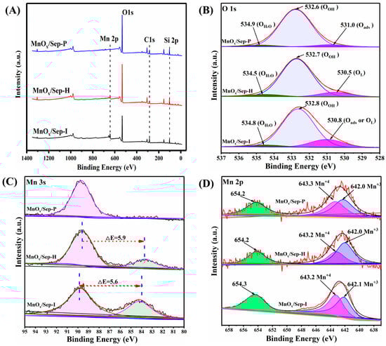 The XPS patterns of wide-scan spectra (A), O 1s (B), Mn 3s (C), and Mn 2p (D) of MnOx/Sep-H, MnOx/Sep-P, and MnOx/Sep-I.