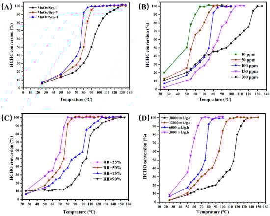 The performance of catalytic oxidation of HCHO. (A) The catalytic activity of MnOx/Sep-H, MnOx/Sep-P, and MnOx/Sep-I (reaction conditions: 100 ppm of HCHO, WHSV 6000 mL/(g·h)); (B) Effects of different HCHO concentrations on catalytic oxidation of HCHO over MnOx/Sep-H (reaction conditions: RH of 50% and GHSV 6000 mL/(g·h)); (C) Effects of different reaction humidities on catalytic oxidation of HCHO over MnOx/Sep-H (reaction conditions: 100 ppm of HCHO and GHSV 6000 mL/(g·h)); (D). Effects of different GHSV on MnOx/Sep-H catalyst activity. (reaction conditions: 100 ppm of HCHO and RH of 50%).
