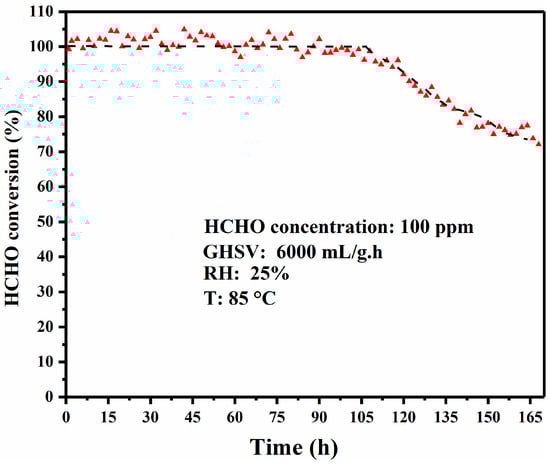 The stability of oxidative degradation of 100 ppm HCHO over MnOx/Sep-H at 85 °C, GHSV of 6000 mL/(g·h) and RH of 25%.